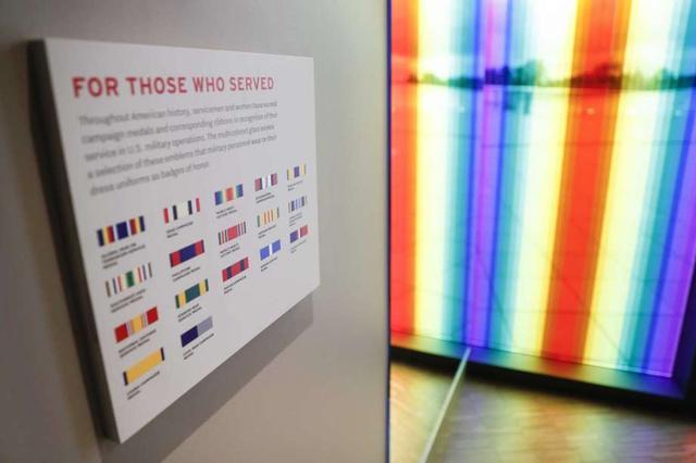 A military ribbon display and associated legend of symbols is located on the upper floor during a limited media availability at the National Veterans Museum and Memorial, Monday, Oct. 15, 2018, in Columbus, Ohio. A sweeping new museum in America's heartland honors the unifying experiences of U.S. military veterans outside the traditional trappings of military museums and war memorials. The 50,000-square-foot museum, which opens Oct. 27 in Columbus, Ohio, aims to honor, inspire, connect and educate with unique interactive experiences. less