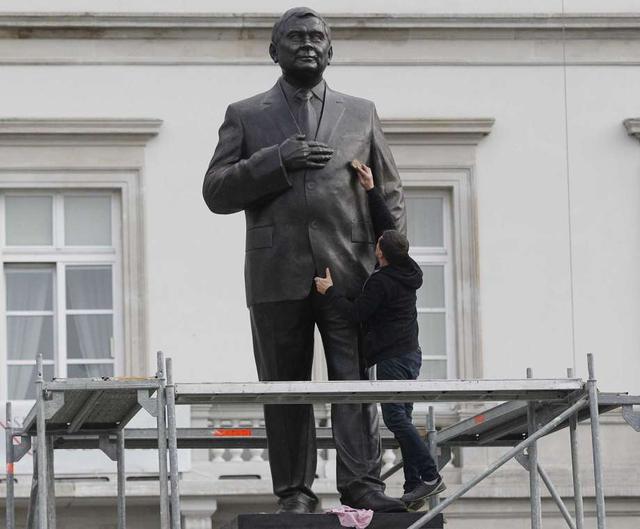 A worker cleans a statue depicting late Polish President Lech Kaczynski after it was installed at a central square in Warsaw, Poland, Wednesday Nov. 7, 2018. Kaczynski, who was killed in a 2010 plane crash in ... more