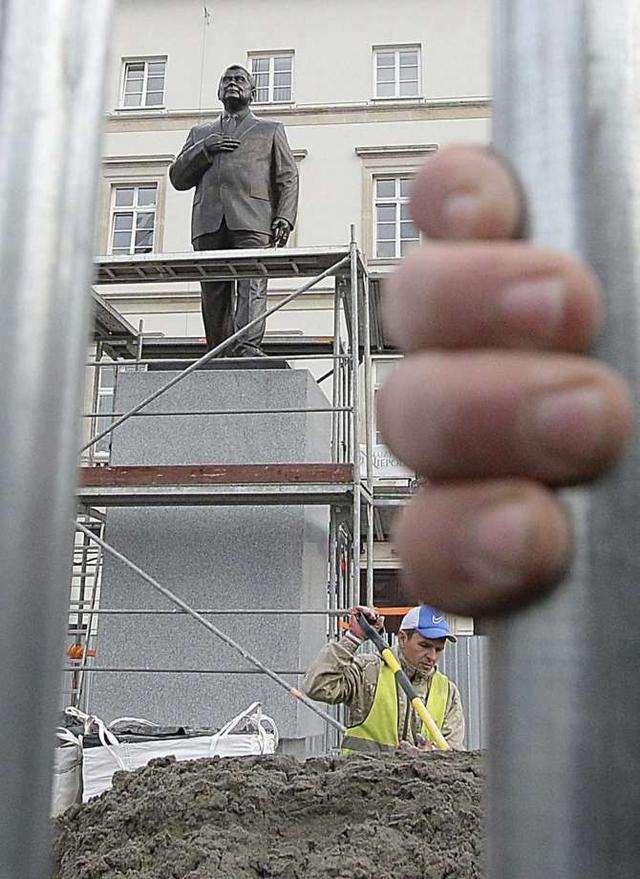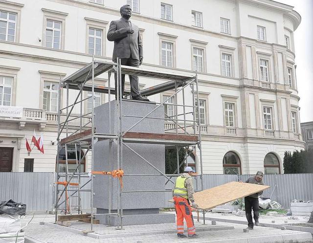 Workers polish the new monument to late President Lech Kaczynski who died in a 2010 plane crash, just days before the ceremonious unveiling of the monument, that is a point of political contention, in Pilsudski ... more