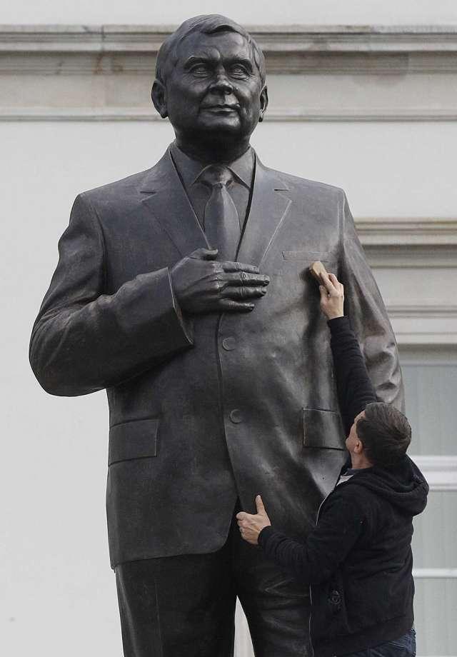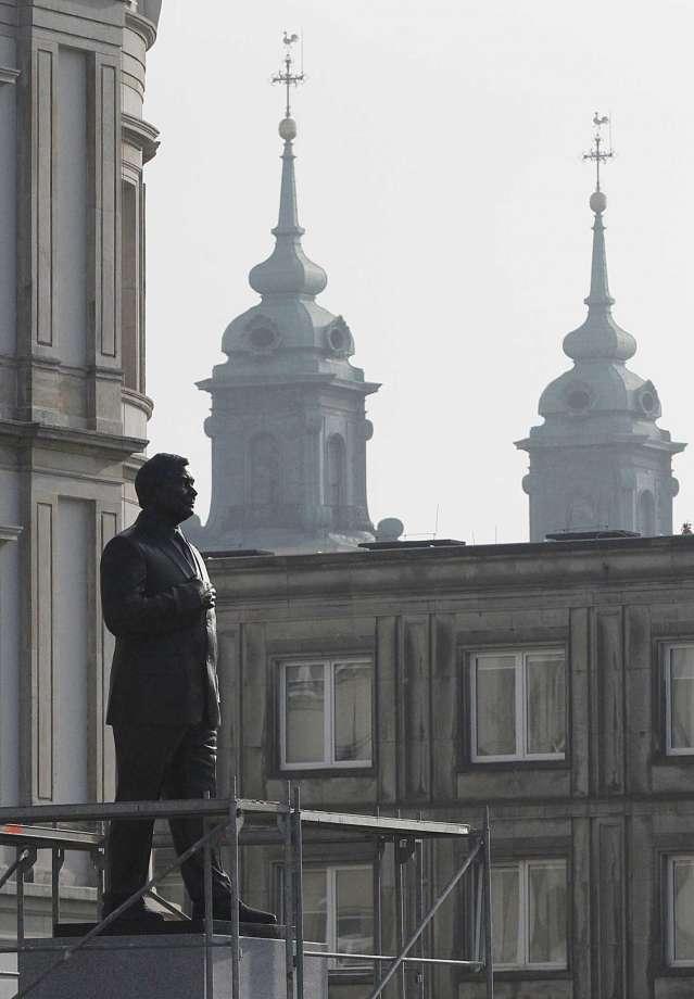 A statue depicting late Polish President Lech Kaczynski stands at a central square in Warsaw, Poland, Wednesday Nov. 7, 2018. Kaczynski, who was killed in a 2010 plane crash in Russia, was the twin brother of ... more