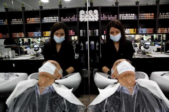 A man gets a hair cut at a hairdressing salon in Sevres, outside Paris, Monday, May 11, 2020. The French began leaving their homes and apartments for the first time in two months without permission slips as the country cautiously lifted its lockdown. Clothing stores, coiffures and other businesses large and small were reopening on Monday with strict precautions to keep the coronavirus at bay. less