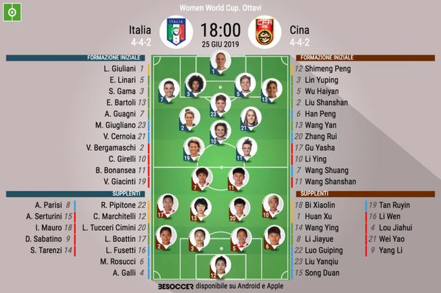 Sono state rese note le formazioni iniziali di Italia-Cina, ottavo di finale dei Mondiali femminili di calcio.