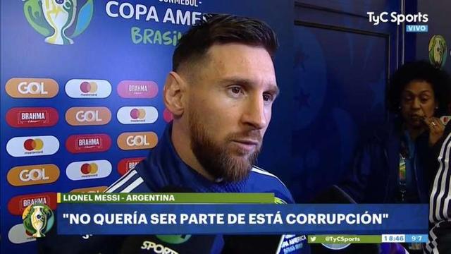 Lionel Messi, dopo non aver ritirato la medaglia di bronzo, è comparso di fronte ai microfoni dei giornalisti che lo attendevano in zona mista: "Non dobbiamo far parte di questa corruzione. È una mancanza di rispetto che ci è stata fatta durante tutta la Copa America!".