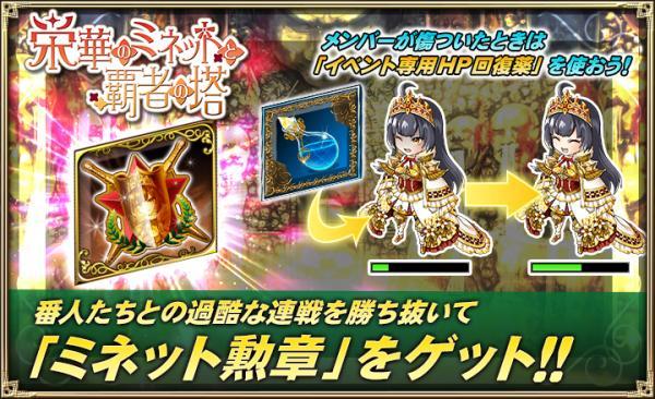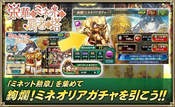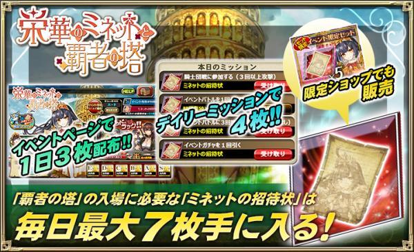 なお、「覇者の塔」の入場に必要なイベントアイテム「ミネットの招待状」は、デイリーミッションの報酬などで毎日最大7枚入手できるほか、限定ショップでも購入可能です。