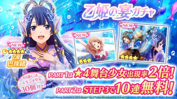 『少女☆歌劇 レヴュースタァライト-Re LIVE-(スタリラ)』にて、2019年8月5日(月)より、新イベント「愛しき竜宮城の日々」が開催中です。本イベントは、童話「浦島太郎」をモチーフとしており、新舞台少女として「乙姫 巴珠緒」と「浦島太郎 秋風塁」が登場します。