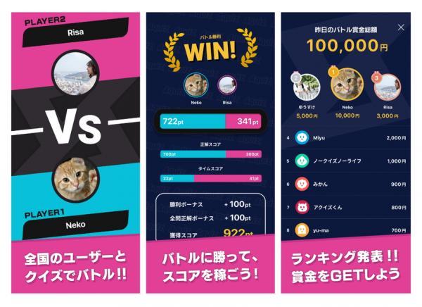 365日、毎日開催される高額賞金バトルにクイズで遊びながら気軽に参戦できます。ユーザバトルは0時から開始され、24時間内で競い合い、翌朝10時に勝者が発表され賞金が授与される仕組みです。