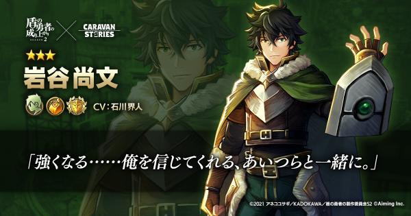 2021年3月16日(火)メンテナンス後より、順次開催される本コラボでは、「岩谷尚文(CV:石川界人)」「ラフタリア(CV:瀬戸麻沙美)」「フィーロ(CV:日高里菜)」がコラボキャラクターとして登場します。
