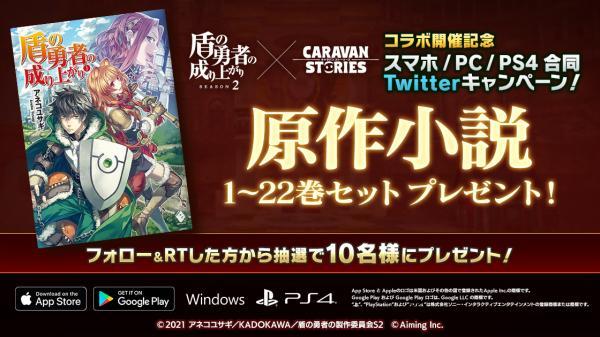 本キャンペーンでは、公式Twitterアカウント(@CaravanStories)をフォローし、対象ツイートをRTすると、抽選で10名に「盾の勇者の成り上がり」原作小説1~22巻セットが当たります。