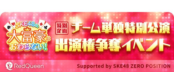 イベント期間中、アプリ内で開催されている「推しメンイベント」にて、チームS、チームKII、チームE、研究生のチームごとにポイントを集計します。チームポイントのトップチームは「SKE48の大富豪はおわらない!チーム単独特別公演 Supported by SKE48 ZERO POSITION」の出演権を獲得します。