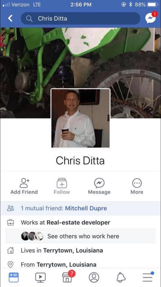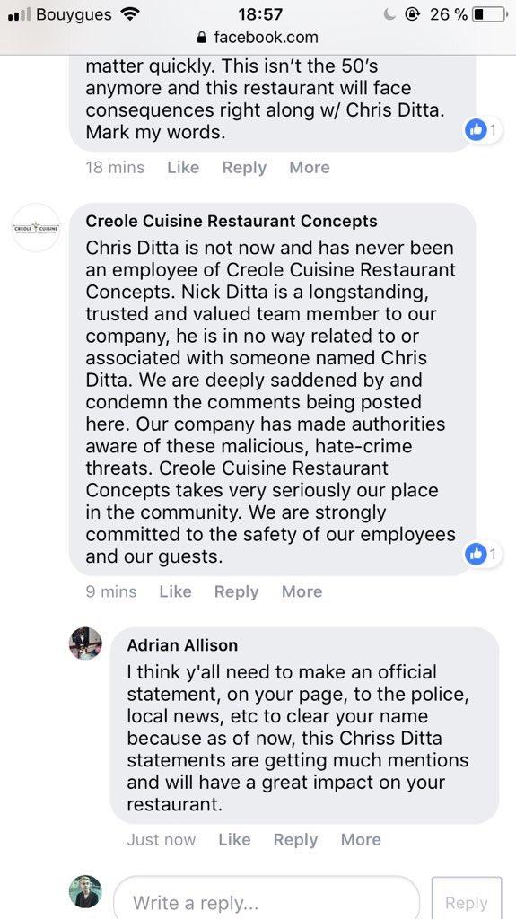 Chris Ditta has deleted his Facebook but folks are still trying to figure out where the racist man works. They have sent messages to another business called Creole Cuisine Concepts where a man with the last name “Ditta” had been employed. But, they deny employing such a horrible person.