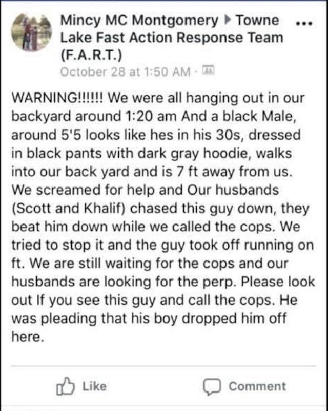 He’s pointing out that in a post in the Towne Lake Fast Action Response Facebook group, a woman claimed that a black man walked into her backyard and her husband and another man “beat him down” while they called the cops. “He was pleading that his boy dropped him off here,” wrote the woman. King believes the man that was “beat down” was Jordan.