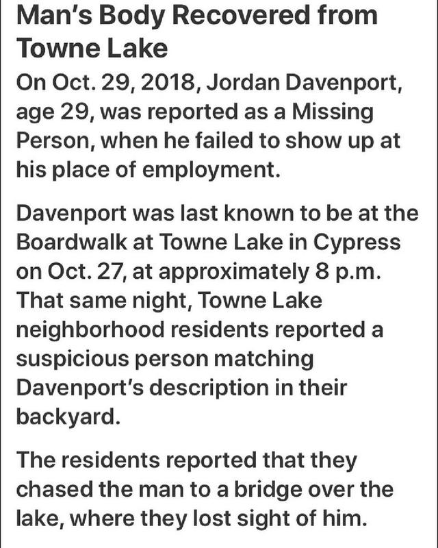 Police are searching for answers in the death of a Texas man who was found dead in Cypress Lake. Jordan Davenport, 30, was last seen October 31 in the Towne Lake area after dropping a friend off from a Halloween party. His body was found days later and there were signs he’d been beaten.