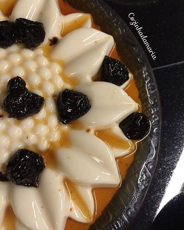 Em uma panela cozinhe as ameixas com a água e o açúcar, em fogo médio por 30 minutos. Deligue e deixe amornar. Desenforme o manjar e despeje a calda com as ameixas.