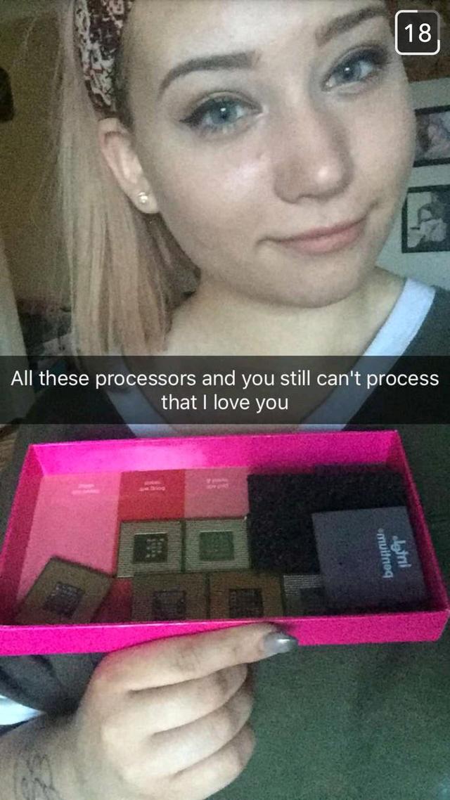 At first, I couldn't tell who in this Snapchat is the nerd; is is the girl who is reaching out to her partner by referencing these computer processors? Or, is it the person who owns the processors? If you're anything like me, your mind probably goes right to the person is legitimately a geek. Granted, I'm aware that a geek and a nerd are slightly different things, but we don't need to get into that argument right now.