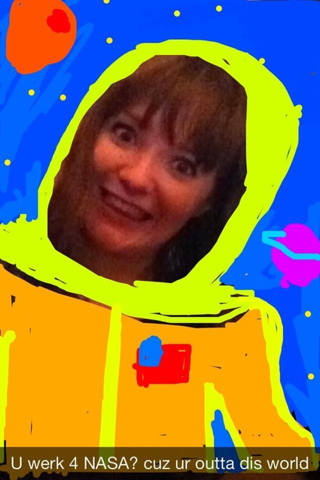 Honestly, if this guy wants to date this girl he's going to have to hop aboard a flight to Mars because that's probably where she's from. You think that was mean of me? C'mon, just look at this Snapchat and tell me otherwise. I think that it's very generous to claim that this is a painting of an astronaut in space. Sure, we know that based on the caption she's used. But she could just as easily be underwater in a scuba-diving suit with colorful fish swimming around her. That or, she's wearing a colorful Middle Eastern outfit while walking around at night. The point is, it doesn't really look like a space suit. And the crazed look on her face isn't helping matters. I'm pretty sure Neil Armstrong, Sally Ride, or Buzz Aldrin looked this depraved when risking their lives for space exploration.