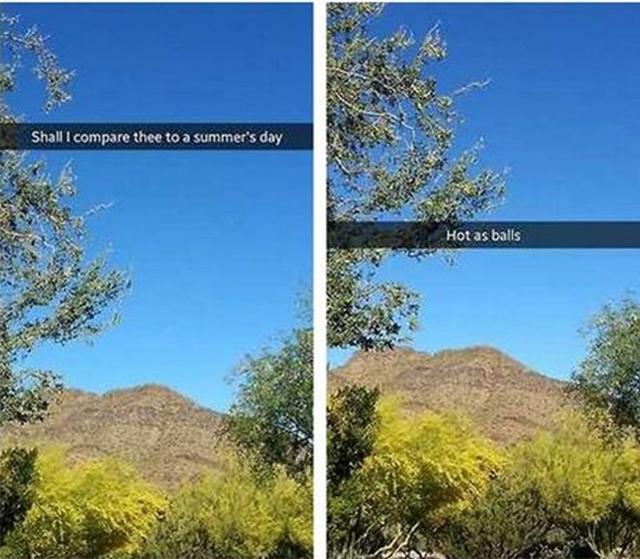 So, I give this guy or girl the highest marks for referencing William Shakespeare so hilariously. It's not only funny, but it's also completely relatable. Who can look at these photos and not think about a swelteringly hot day we wish would just cool down a bit. In fact, that thought reminds me of a joke I recently heard; "It was so hot outside that my bits were stuck to someone else's' leg." Ah, how graphic and relatable.