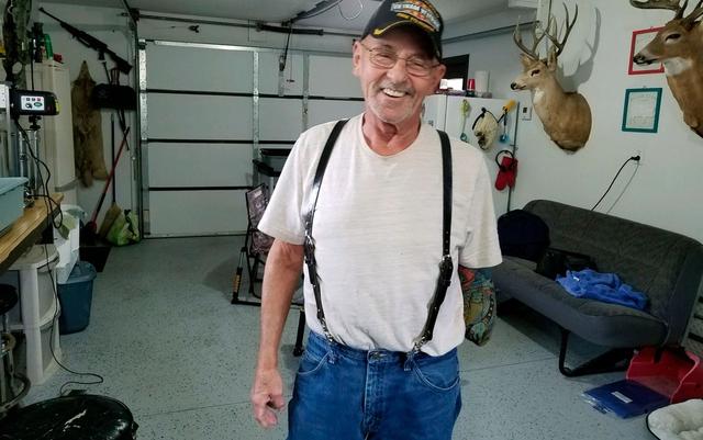 Myron Schlafman posa para foto na garagem de sua casa em Jamestown, na Dakota do Norte, na terça-feira (25) — Foto: KFGO Radio via AP