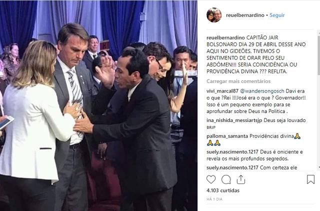 Reuel escreveu: “CAPITÃO JAIR BOLSONARO DIA 29 DE ABRIL DESSE ANO AQUI NO GIDEÕES, TIVEMOS O SENTIMENTO DE ORAR PELO SEU ABDÔMEN!!! SERIA COINCIDÊNCIA OU PROVIDÊNCIA DIVINA ??? REFLITA.”