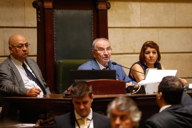 O vereador Jorge Felippe conduz votação em sessão extraordinária na Câmara Municipal do Rio de Janeiro, de projetos de lei de Marielle Franco, assassinada em março.