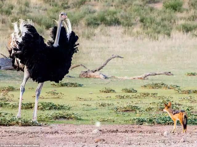 However, with a male ostrich weighing in at around 250lbs, and the diminutive jackal tipping the scales at just 30lbs, it soon realised that the bird might prove a tricky meal.And so when the ostrich began puffing out its feathers, the jackal thought better of it and ran off.