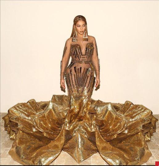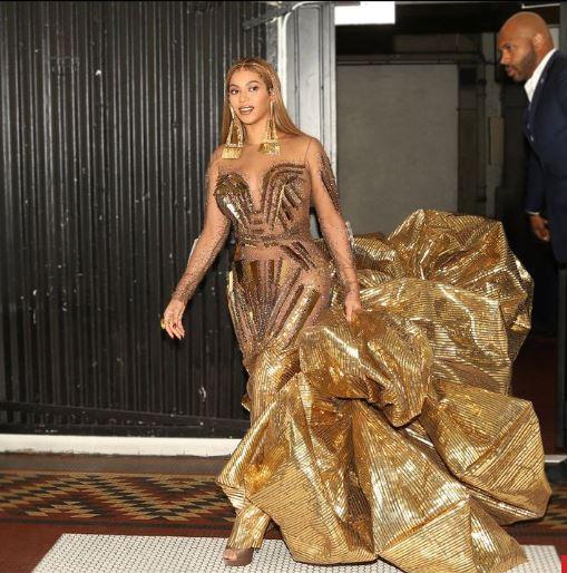 Beyoncé’s custom dress, which she wore on the red carpet, was created by fashion house Falguni Shane Peacock.