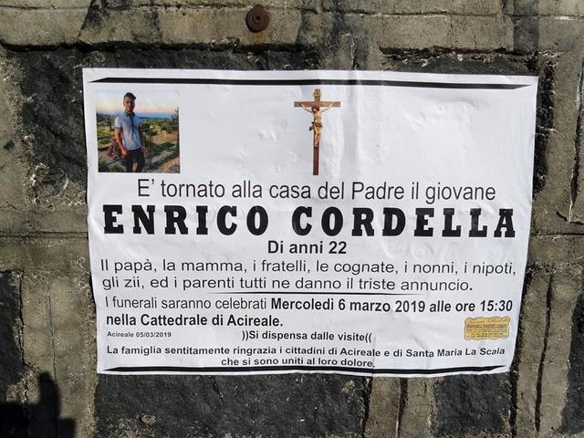 I funerali di Enrico Cordella si svolgeranno oggi alle 15.30 nella Cattedrale di Acireale. Dopo le polemiche che hanno riguardato la decisione del sindaco di Acireale di continuare i festeggiamenti del Carnevale nonostante la morte di questi tre giovani, Alì ha dichiarato: "E' doveroso ringraziare i tre sommozzatori, Rosario e Nino Fichera e Giorgio Condorelli. Enrico è tornato a casa e sono certo di interpretare il sentimento di tutta la comunità cittadina, che in questi giorni si è stretta alle famiglie colpite da una tragedia che non dimenticheremo mai, proclamando il lutto cittadino nel giorno dell’ultimo saluto a Enrico Cordella".