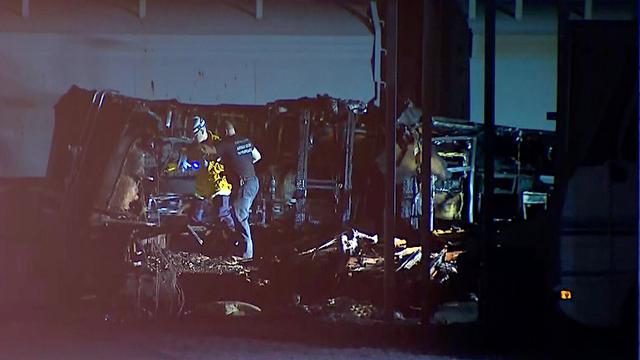 CBS 11 News video shows investigators going through the charred remains of the trailer, that appears to be on its side.