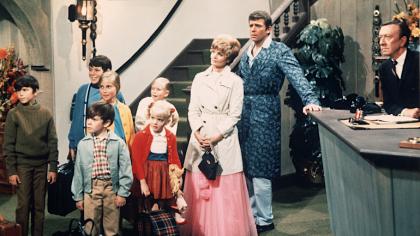 Actors Robert Reed and Florence Henderson stand in a hotel lobby with their television family in a still from the TV series ‘The Brady Bunch,’ circa 1969. (L-R) Christopher Knight, Barry Williams, Mike Lookinland, Maureen McCormick, Eve Plumb, Susan Olsen, Henderson, Reed, unidentified. (credit: Paramount Television/Courtesy of Getty Images)