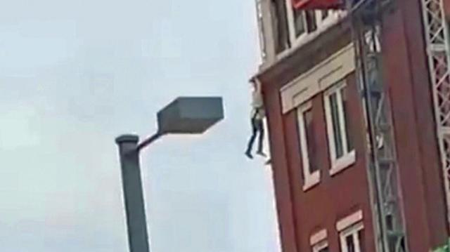 A bystander took images and video of a construction worker holding on to the side of the building, six stories up. The worker, who still had his safety gear on was not injured.