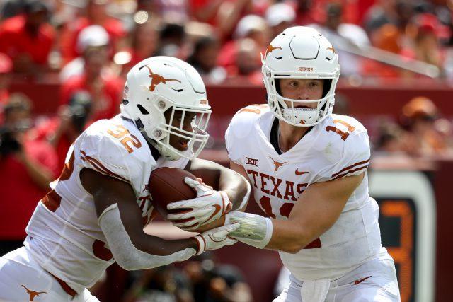 Sam Ehlinger #11 of the Texas Longhorns hands the ball off to Daniel Young #32 during the first half against the Maryland Terrapins at FedExField on September 1, 2018 in Landover, Maryland. (Photo by Rob Carr/Getty Images)