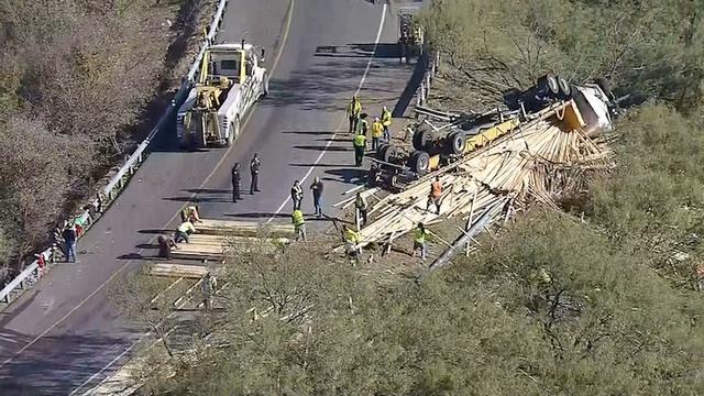 The semi veered off the roadway in the bend of a curve, flipping the cab and trailer upside-down, and all spilling lumber and debris all over the road.