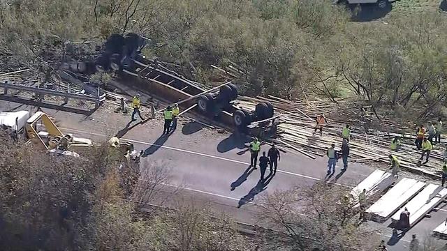 FORT WORTH (CBSDFW.COM) – Traffic on Highway 287 and Loop 820 in Fort Worth was backed up for miles Friday after an 18-wheeler carrying lumber crashed off a connector bridge.