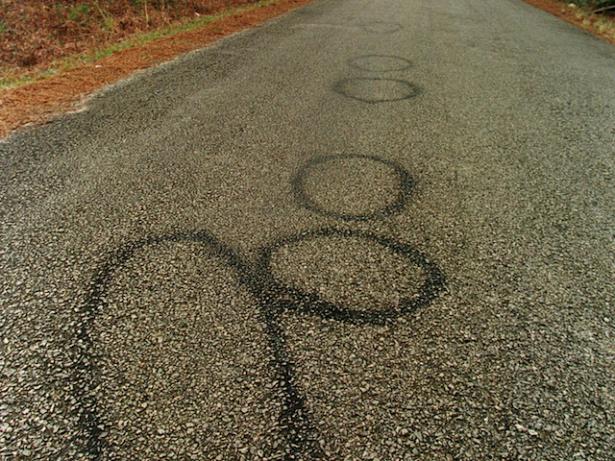 Painted circles that marked evidence in the dragging death of James Byrd Jr., visible on the county road outside Jasper, Texas on January 27, 1999. (credit: Paul Buck/AFP/Getty Images)