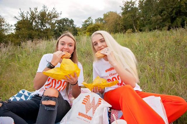 In addition to their Whataburger drinks and eats, they wore custom orange-and-white “Class of 2020” t-shirts with table markers on them.