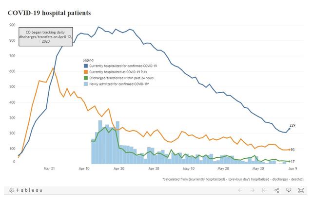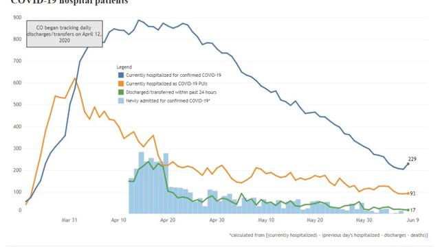 Currently, 229 people are hospitalized with the virus in Colorado, an increase of 25 people from Sunday. It is the largest day-to-day increase of hospitalizations in the state since April 19.