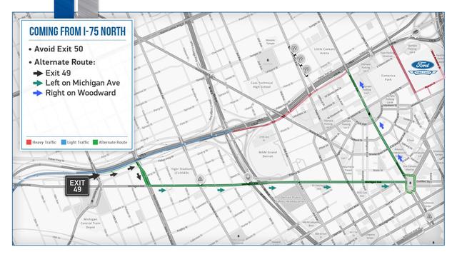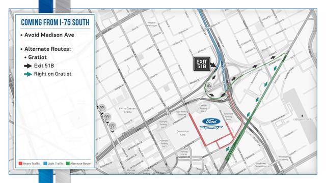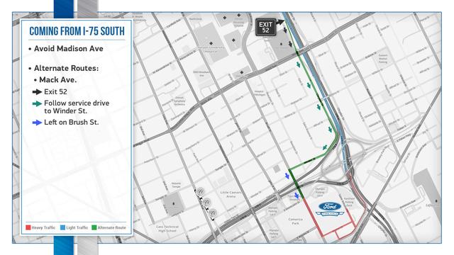Southbound I-75 at the Madison Avenue exit can get backed up, try exiting at Mack Avenue (Exit 52) and follow the service drive and turn right on to Winder Street, then turn left onto Brush Street and Ford Field will be straight ahead.