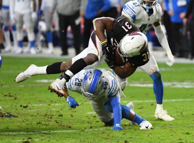 GLENDALE, ARIZONA – DECEMBER 09: David Johnson #31 of the Arizona Cardinals dives over the tackle of Quandre Diggs #28 the Detroit Lions at State Farm Stadium on December 09, 2018 in Glendale, Arizona. (Photo by Norm Hall/Getty Images)