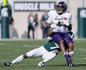 EAST LANSING, MI – OCTOBER 15: Wide receiver Solomon Vault #4 of the Northwestern Wildcats is tackled by Demetrious Cox #7 of the Michigan State Spartans after a reception during the first half at Spartan Stadium on October 15, 2016 in East Lansing, Michigan. (Photo by Duane Burleson/Getty Images)