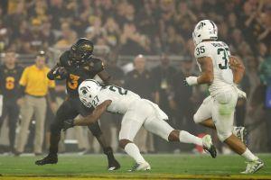 TEMPE, AZ – SEPTEMBER 08: Running back Eno Benjamin #3 of the Arizona State Sun Devils rushes the football past safety Khari Willis #27 of the Michigan State Spartans during the college football game at Sun Devil Stadium on September 8, 2018 in Tempe, Arizona. The Sun Devils defeated the Spartans 16-13. (Photo by Christian Petersen/Getty Images)