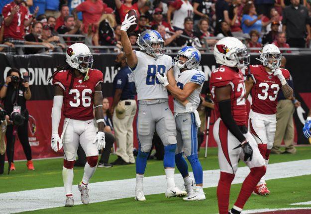 GLENDALE, ARIZONA – SEPTEMBER 08: TJ Hockenson #88 of the Detroit Lions celebrates with Danny Amendola #80 after catching a touchdown pass during the fourth quarter of a game against the Arizona Cardinals at State Farm Stadium on September 08, 2019 in Glendale, Arizona. (Photo by Norm Hall/Getty Images)