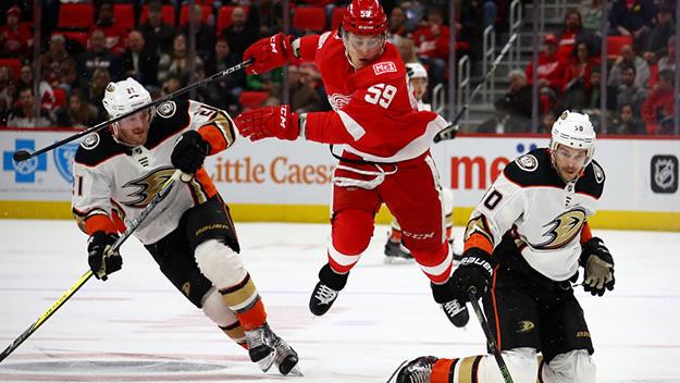 Gustav Nyquist broke a tie with 4:16 left and Darren Helm scored a little later, lifting the Detroit Red Wings over the Ducks 3-1 on Tuesday night to extend their franchise-record losing streak to 12 games.