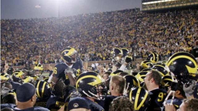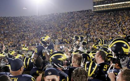 ANN ARBOR, MI – OCTOBER 15: Wide receiver Mario Manningham #86 of the Michigan Wolverines celebrates with teammates after scoring the game winning touchdown against the Penn State Nittany Lions at Michigan Stadium on October 15, 2005 in Ann Arbor, Michigan. The Wolverines defeated the Nittany Lions 27-25. (Photo by Tom Pidgeon/Getty Images)