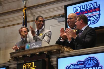 NEW YORK, NY – APRIL 10: University of Connecticut men’s basketball coach Kevin Ollie (L), UConn athletic director Warde Manuel, (C), and UConn Women’s Basketball coach Geno Auriemma (R), clap at the closing bell of the New York Stock Exchange on April 10, 2014 in New York City. The UConn men’s and women’s teams won the NCAA basketball championships this week. The Dow Jones Industrial Average dropped 267 points to close at 16,170 Friday. (Photo by John Moore/Getty Images)