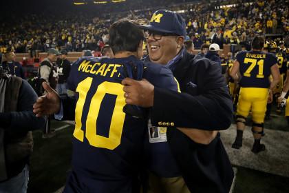 ANN ARBOR, MI – OCTOBER 13: Michigan Wolverines Athletic Director Warde Manuel hugs Dylan McCaffrey #10 after a 38-13 win over the Wisconsin Badgers on October 13, 2018 at Michigan Stadium in Ann Arbor, Michigan. (Photo by Gregory Shamus/Getty Images)