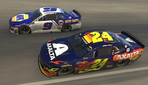 FORT WORTH, TEXAS – MARCH 29: Chase Elliott, driver of the #9 NAPA Auto Parts Chevrolet, races William Byron, driver of the #24 Axalta Chevrolet, during the eNASCAR iRacing Pro Invitational Series Race – O’Reilly Auto Parts 125 at virtual Texas Motor Speedway on March 29, 2020 in Fort Worth, Texas. (Photo by Chris Graythen/Getty Images)