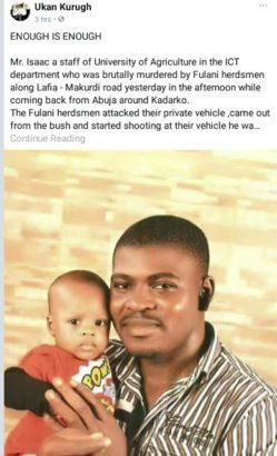 Mr. Isaac a staff of University of Agriculture in the ICT department who was brutally murdered by Fulani herdsmen along Lafia – Makurdi road yesterday in the afternoon while coming back from Abuja around Kadarko.