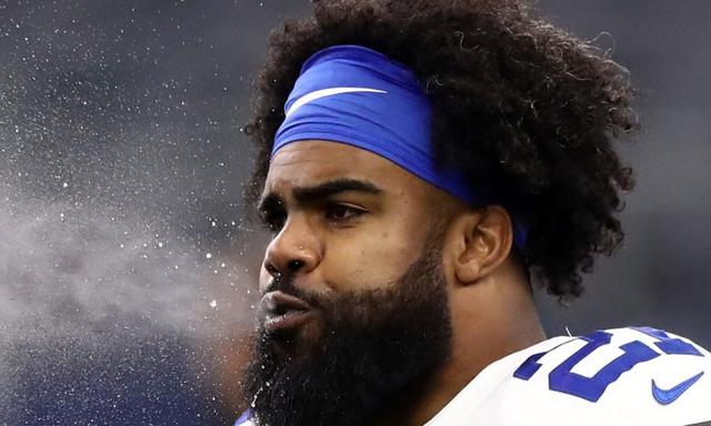 ARLINGTON, TX - SEPTEMBER 30: Ezekiel Elliott #21 of the Dallas Cowboys spits water before a game against the Detroit Lions at AT&T Stadium on September 30, 2018 in Arlington, Texas. (Photo by Ronald Martinez/Getty Images)