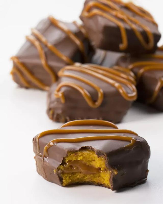 9 Mergulhe os quadradinhos recheados com a ajuda de um garfo no chocolate derretido e cubra com mais chocolate. Levante devagar o garfo para que o chocolate escorra.