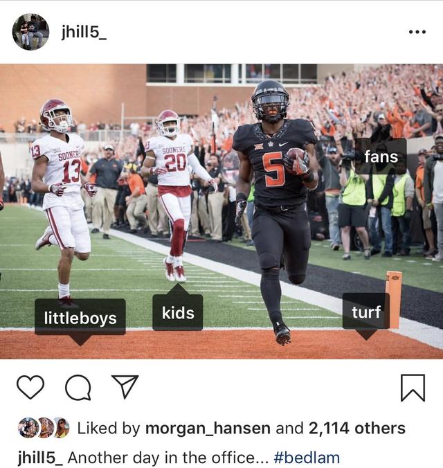 Oklahoma State running back Justice Hill poked some fun on Instagram yesterday. He posted a picture of him scoring a TD in the Bedlam game last year with the caption “Just another day at the office...#Bedlam”. He tag the OU defenders as little boys and kids.