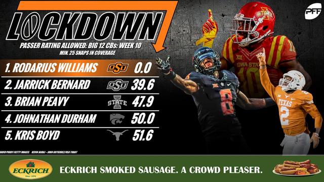 Cornerback Rodarius Williams was the top of Pro Football Talk’s list this week in passing rating allowed. He was all over it on coverage against Baylor. One of the only bright spots in that game. The cornerbacks this week had some fantastic games.